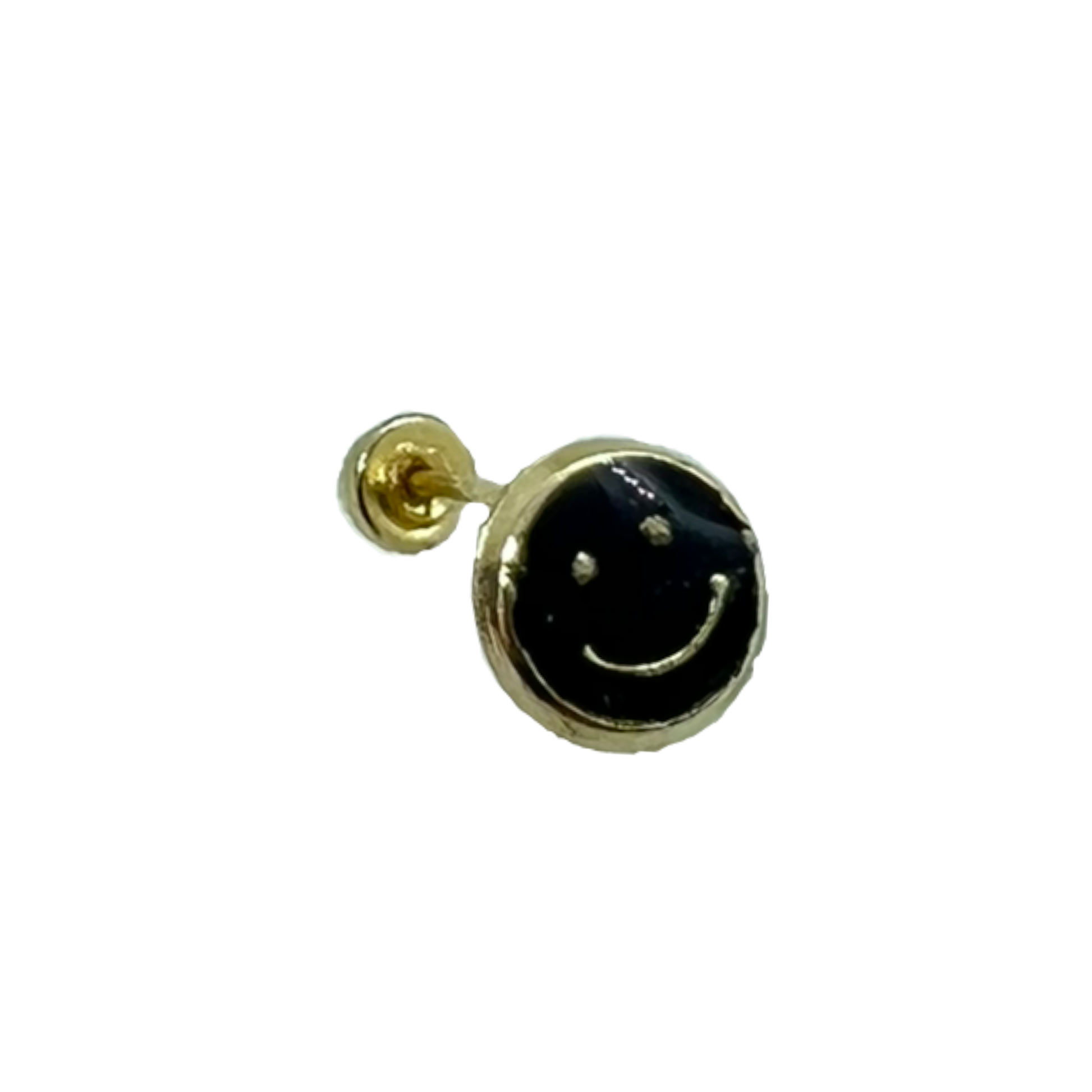 Broquel oro 10 k en forma de carista feliz con esmalte negro.