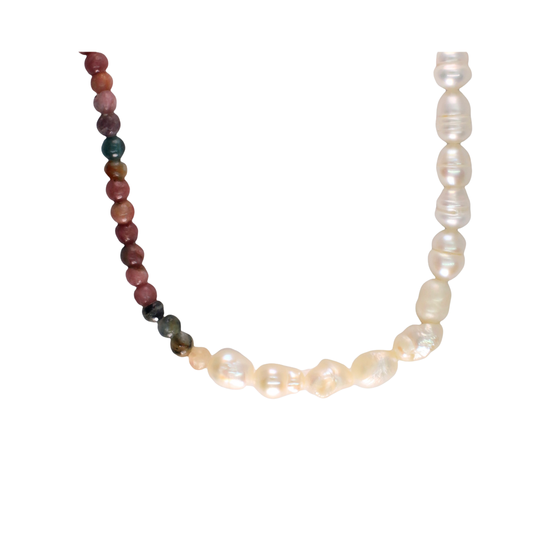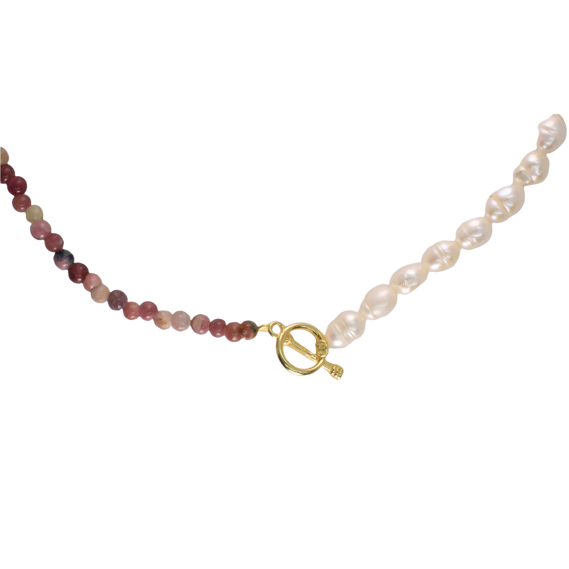 Collar de perlas naturales 3mm + piedra turmalina natural (2mm) con broche en T.